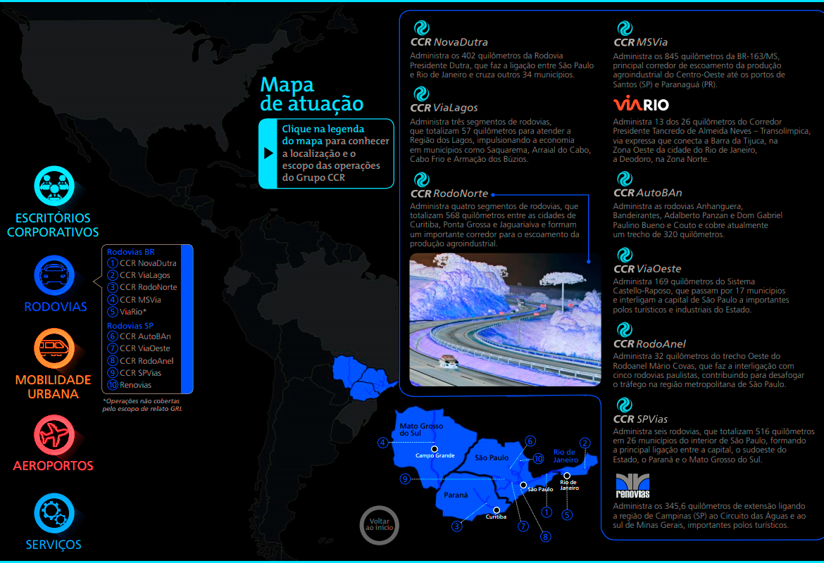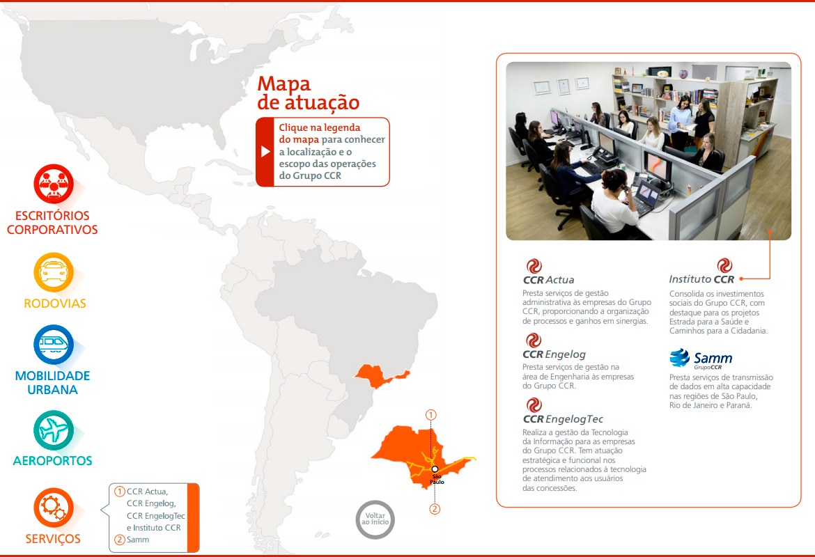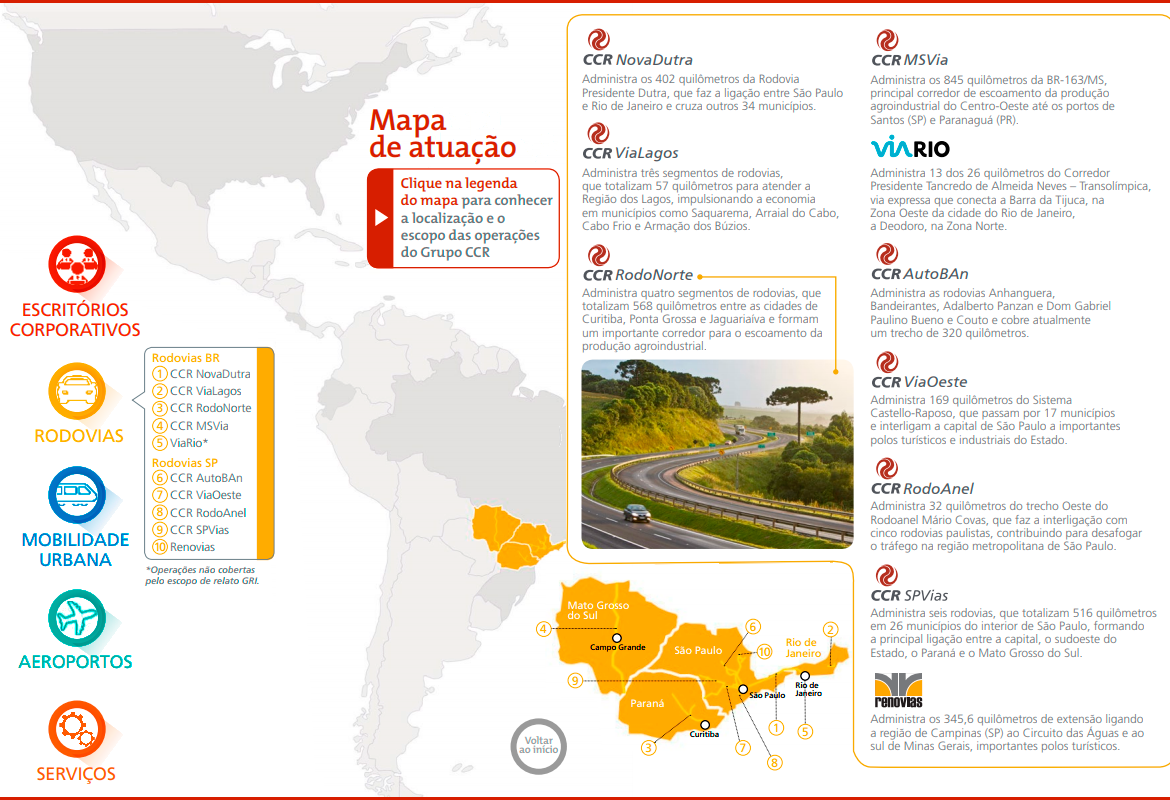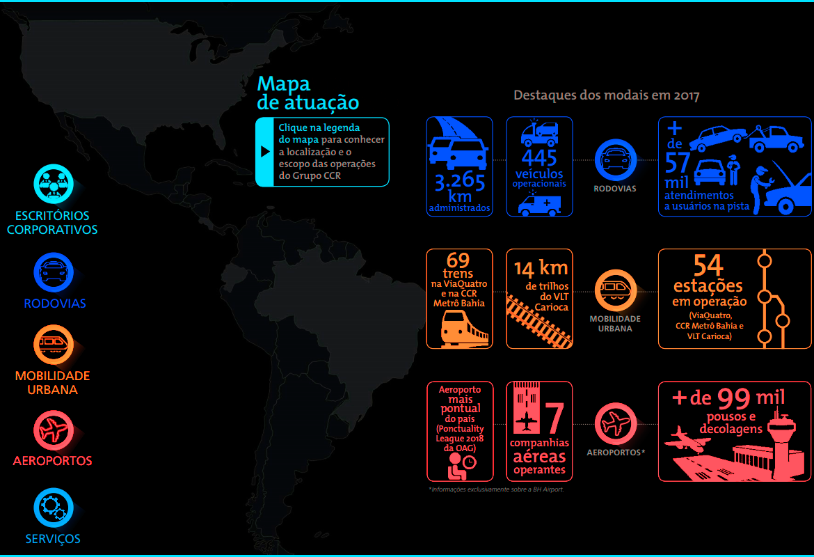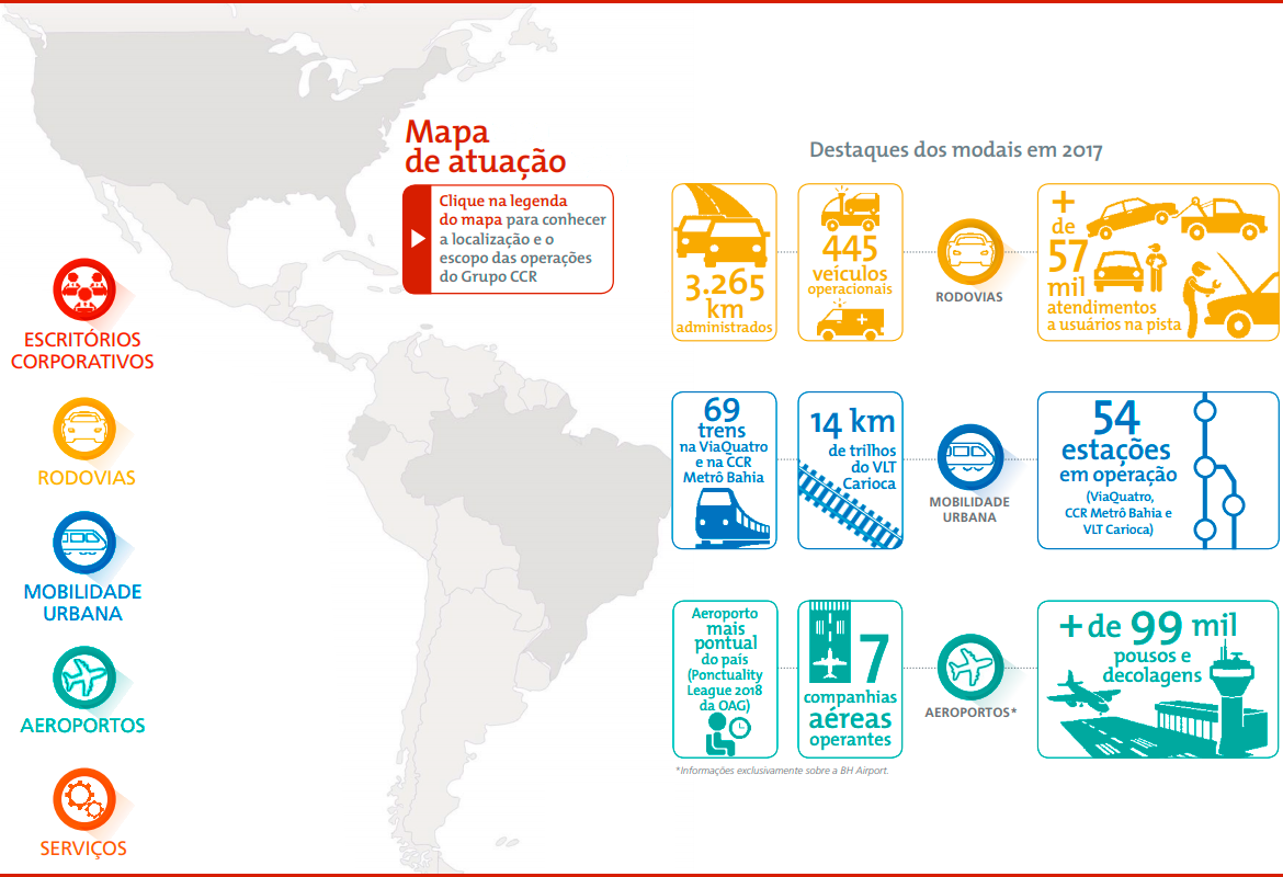 O Grupo CCR foi criado com o propósito de viabilizar soluções de investimentos e serviços em infraestrutura e, assim, contribuir com o desenvolvimento econômico e social do Brasil. Desde 1999, quando foi fundado, o Grupo CCR tem aprimorado as condições das estradas por onde trafegam as pessoas e os produtos que geram as riquezas do país. Ao longo de sua trajetória, expandiu sua atuação para os setores de mobilidade urbana e aeroportos, chegou ao mercado internacional, e colocou todo conhecimento técnico e de gestão a serviço de cidades mais sustentáveis e inteligentes.