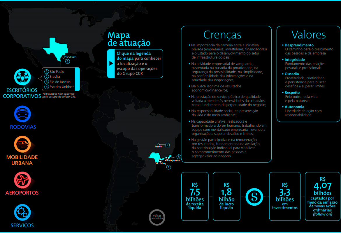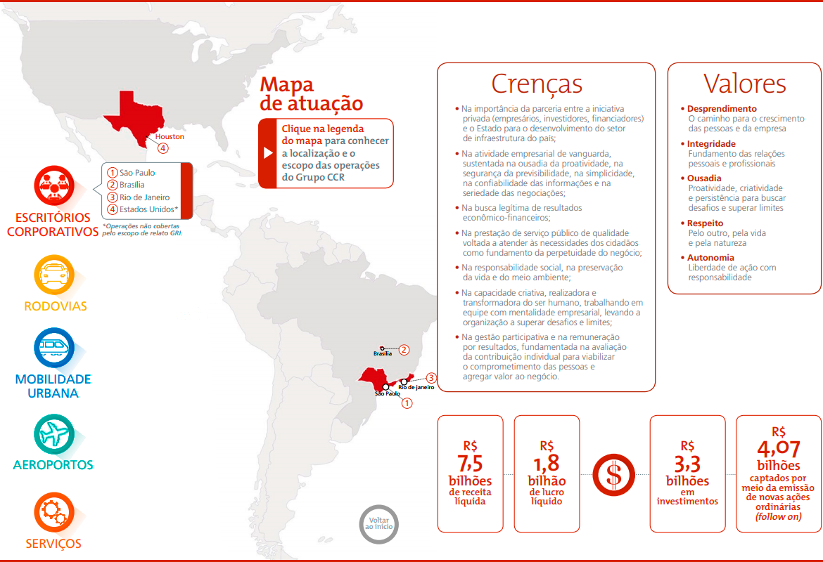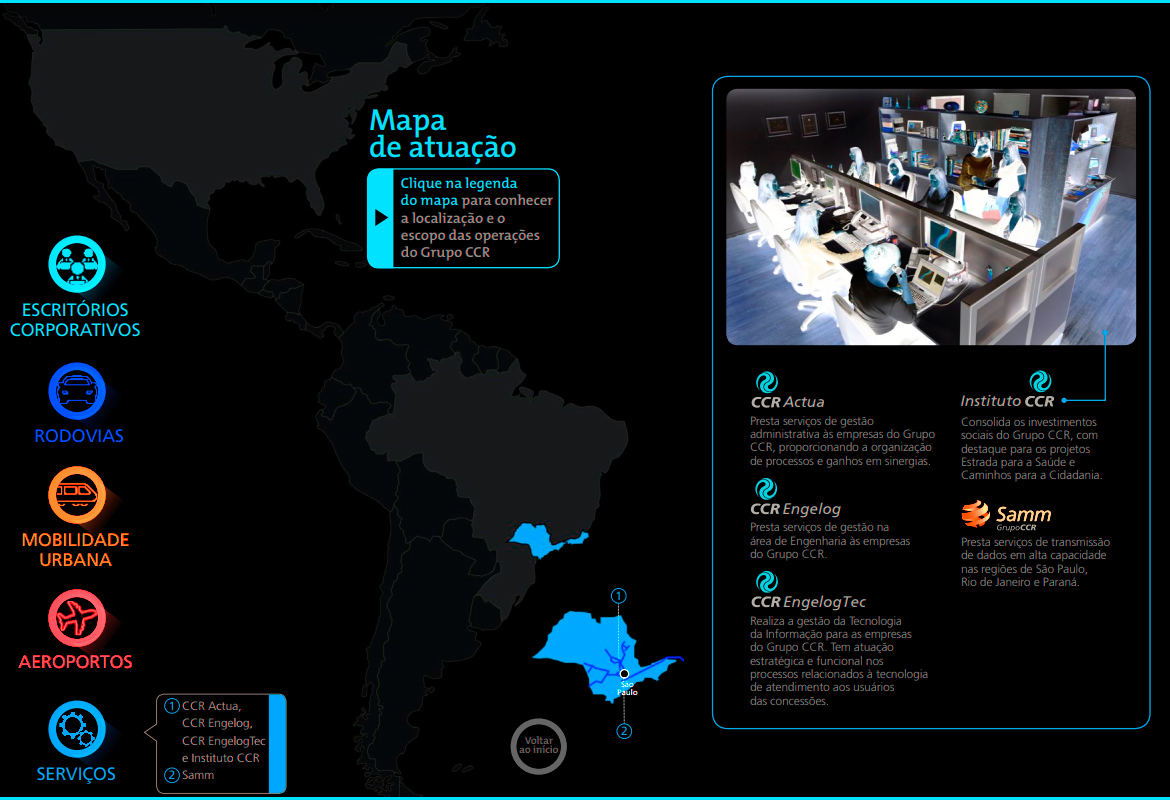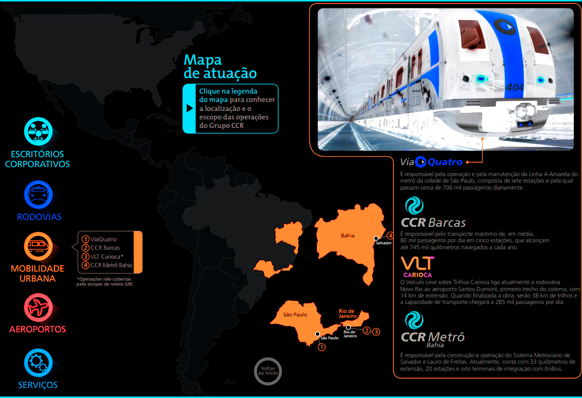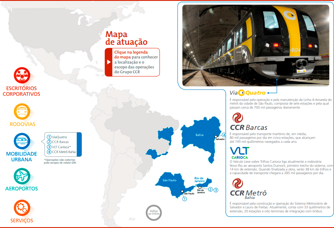 O Grupo CCR foi criado com o propósito de viabilizar soluções de investimentos e serviços em infraestrutura e, assim, contribuir com o desenvolvimento econômico e social do Brasil. Desde 1999, quando foi fundado, o Grupo CCR tem aprimorado as condições das estradas por onde trafegam as pessoas e os produtos que geram as riquezas do país. Ao longo de sua trajetória, expandiu sua atuação para os setores de mobilidade urbana e aeroportos, chegou ao mercado internacional, e colocou todo conhecimento técnico e de gestão a serviço de cidades mais sustentáveis e inteligentes.