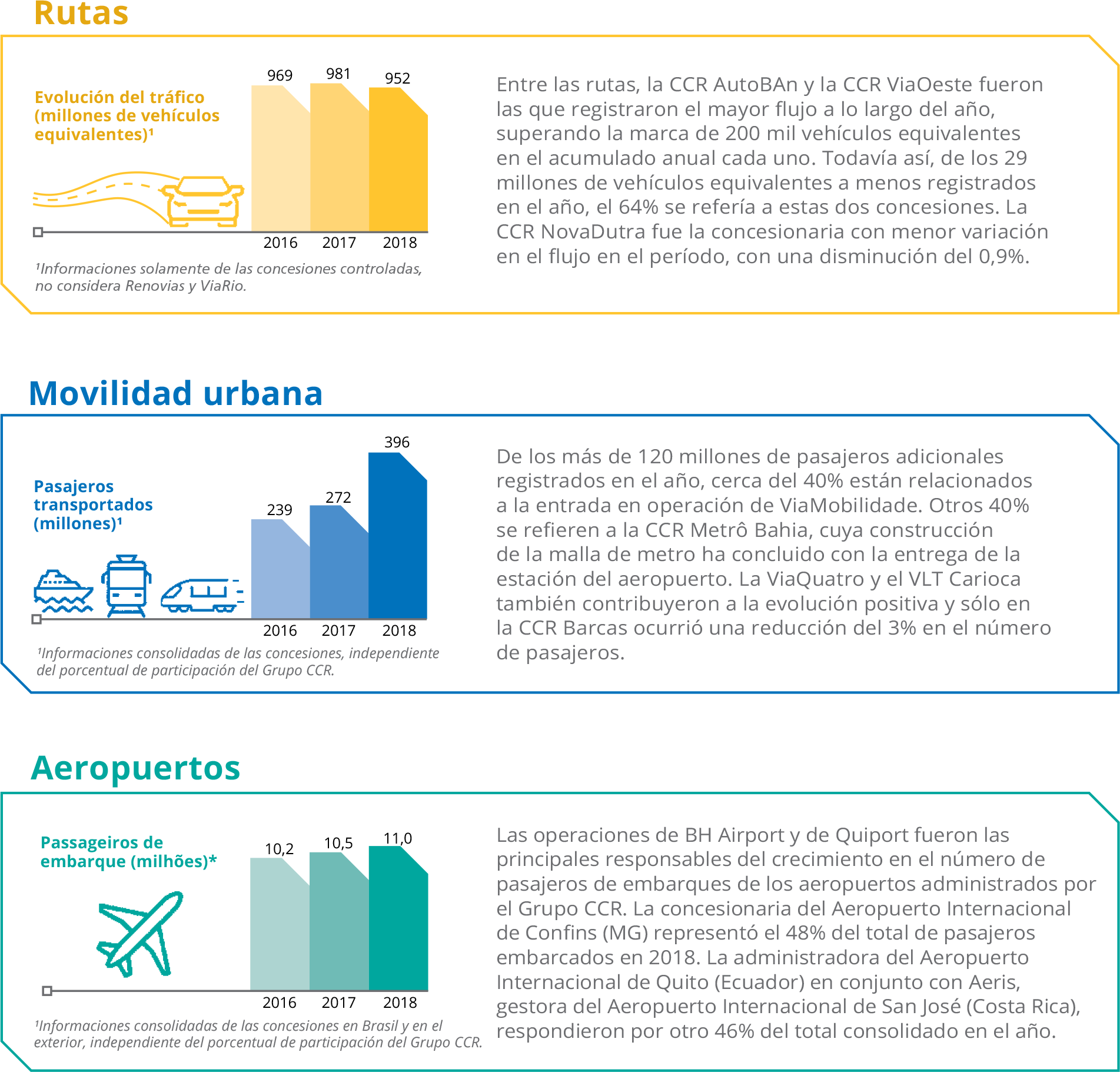En el segmento de movilidad urbana, el volumen de pasajeros transportados presentó un crecimiento del orden de 45% en comparación con 2017, reflejando la conquista de la nueva concesión de la Línea 5-Lila. En los aeropuertos, el número de pasajeros de embarque también subió, con una variación de 5% con relación al año anterior.