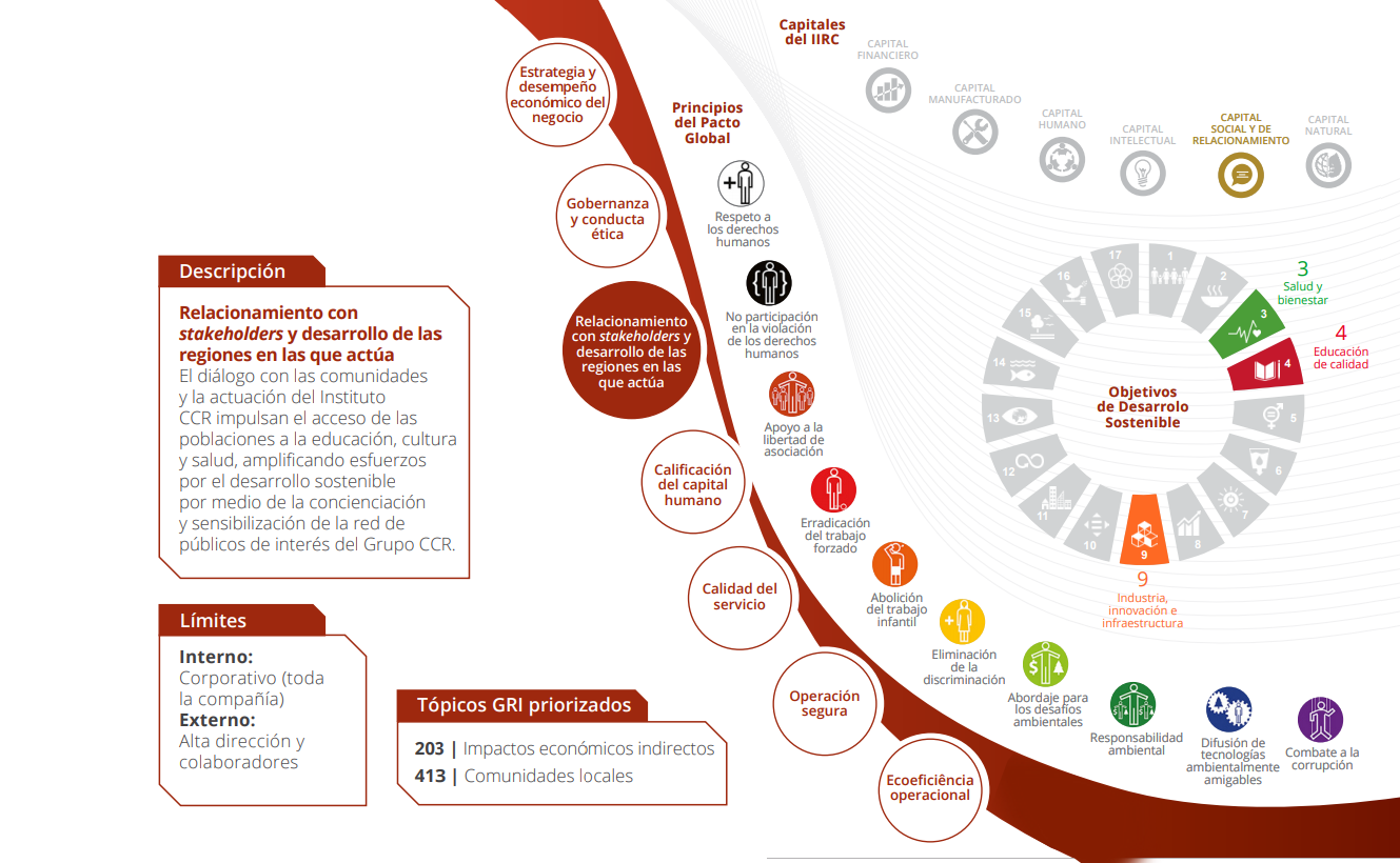 El Informe Anual y de Sostenibilidad 2018 del Grupo CCR divulga de forma transparente al mercado los principales resultados, aprendizajes y perspectivas de negocios. Una de las pioneras en la adopción del framework del relato integrado (IIRC – International Integrated Reporting Council), la compañía sigue también los principios de la Global Reporting Initiative (GRI) y otros parámetros de mercado, como los cuestionarios del Índice de Sostenibilidad Empresarial (ISE) de B3 y del Carbon Disclosure Project (CDP), como referencias para la elaboración de este informe.