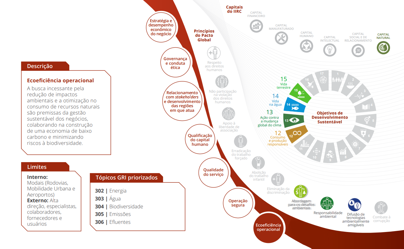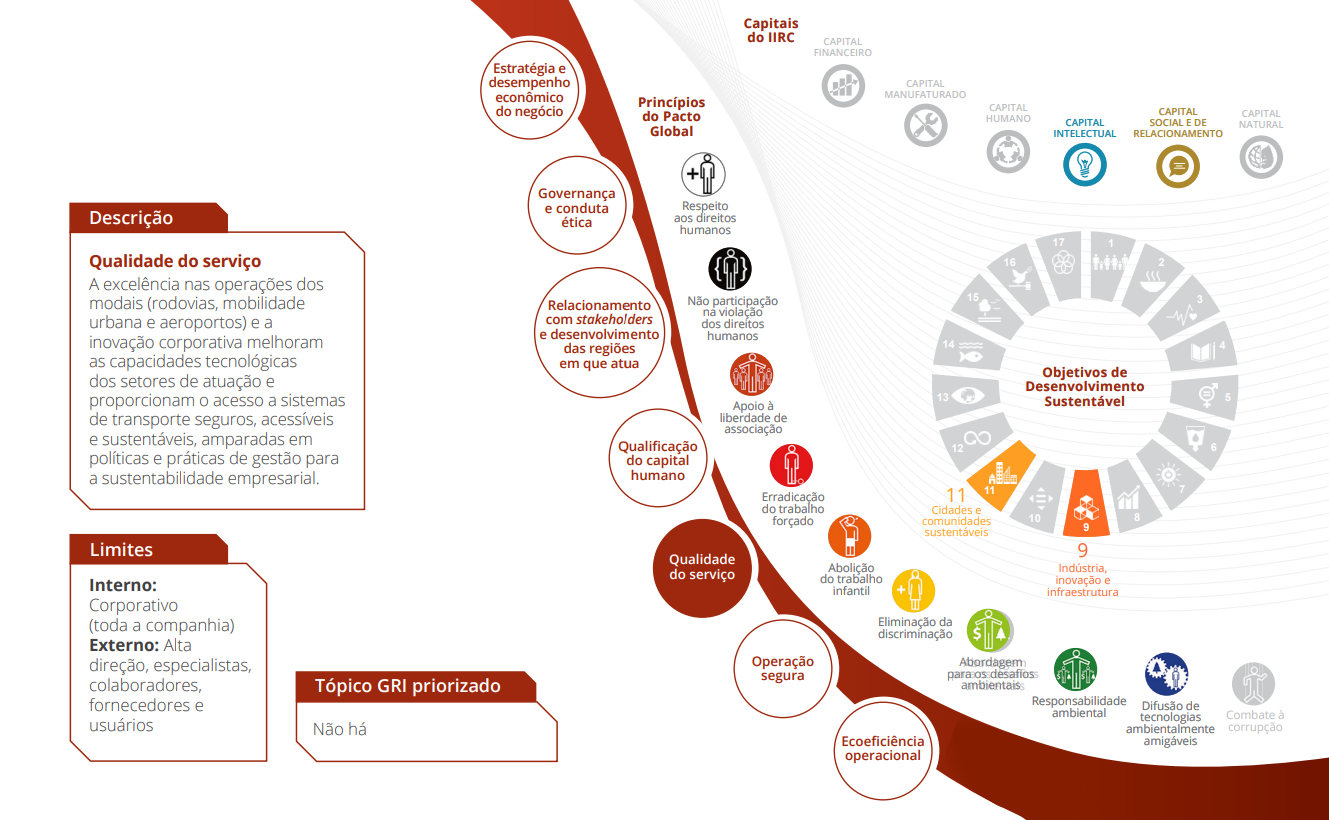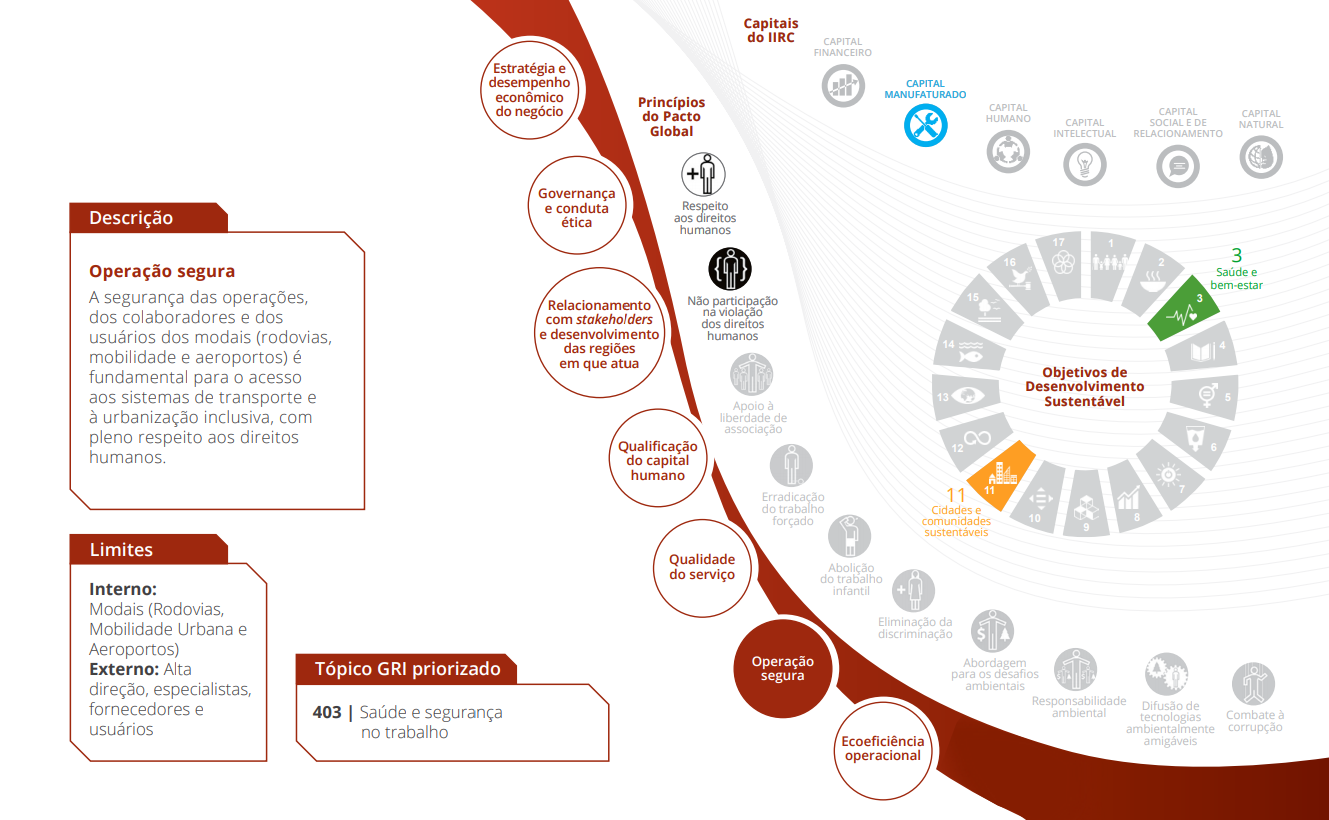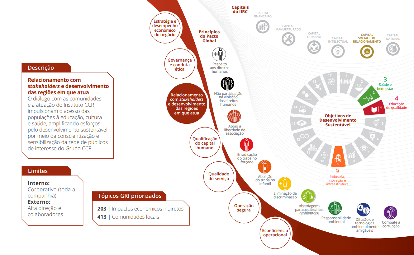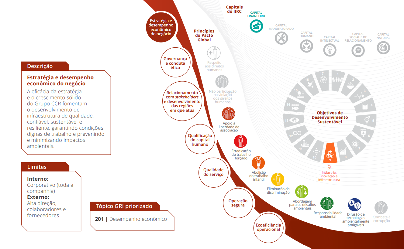 O Relatório Anual e de Sustentabilidade 2018 do Grupo CCR divulga os principais resultados, aprendizados e perspectivas de negócios. Uma das pioneiras na adoção do framework do relato integrado (IIRC – International Integrated Reporting Council), a companhia segue também os princípios da Global Reporting Initiative (GRI) e outros parâmetros de mercado, como os questionários do Índice de Sustentabilidade Empresarial (ISE) da B3 e do Carbon Disclosure Project (CDP), como referências para a elaboração deste relatório.
