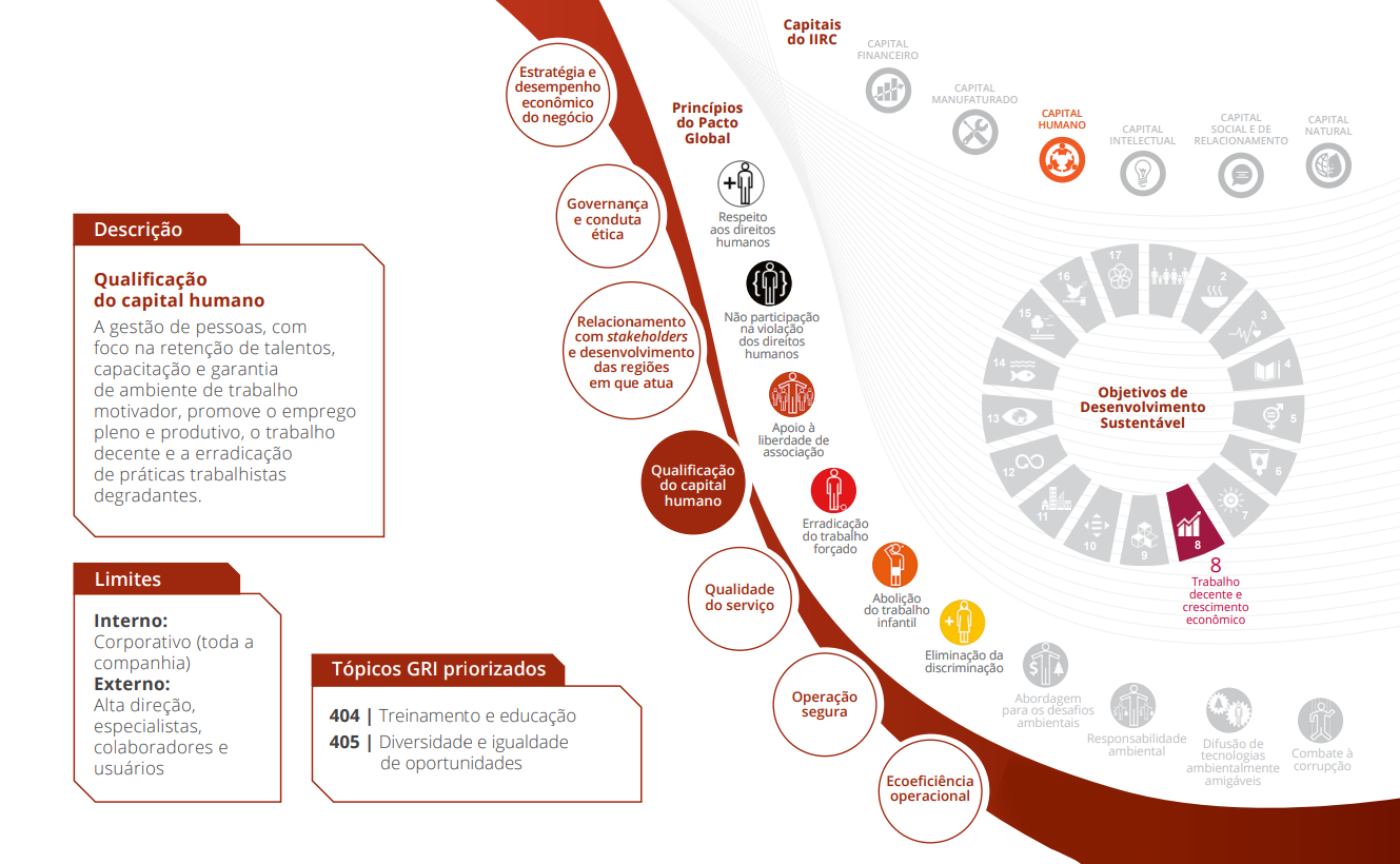 Os temas materiais que norteiam o relatório foram definidos após um amplo processo de engajamento interno e externo e do amadurecimento da gestão sobre esses tópicos. A priorização dos temas partiu dos insumos de engajamento direto e análises documentais realizados em 2016 e teve como principais critérios os riscos e oportunidades associados a cada tema, os impactos significativos das atividades do Grupo e a relação desses aspectos com os Objetivos de Desenvolvimento Sustentável (ODS).